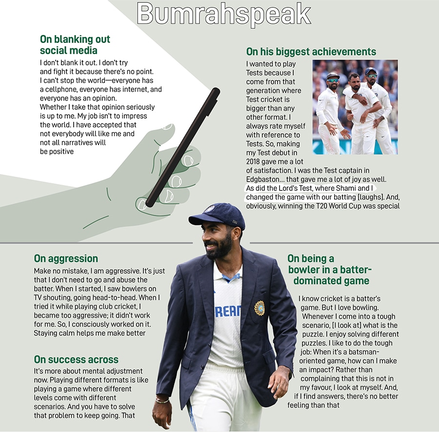 Is leadership something he enjoys? “Leadership, for me, isn’t just about the post. My leadership philosophy is to help others," says Bumrah. “I try to understand what helped me when I came into the team as a youngster. So, if somebody new comes in, even if I’m not the captain, I go up to them and try to make them comfortable, because that helps the team. I’ve seen great leaders leave their level and come on to yours. That’s what I try to do," he says.