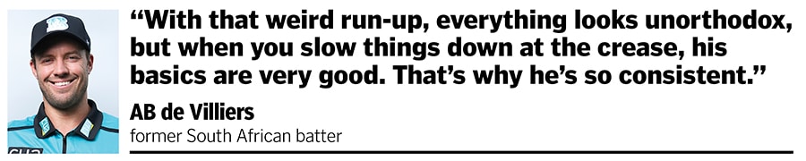 Says de Villiers: “He has a very whippy wrist that gives a lot of torque on the ball, which not a lot of people pick up. He gets a lot of backspin on the ball with his wrists pushing really hard down. But while doing that he’s very upright with his head. With that very weird run-up, everything looks unorthodox, but when you slow things down at the crease, his basics are very good. That’s the reason he’s so consistent."