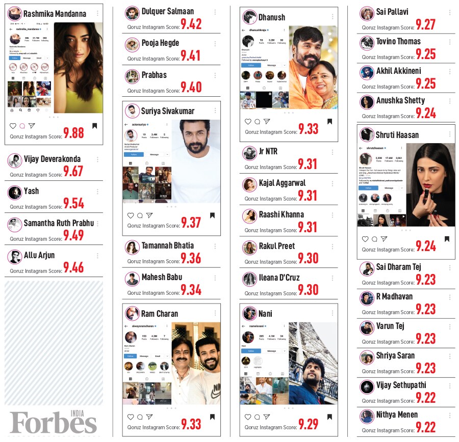 The list of the Top 30 most influential Instagram celebrities from South India was compiled for Forbes India by Social Samosa, a portal for social media industry news and analysis, and Qoruz, a marketing technology firm, that has a digital tool to calculate social media influence. This influence is represented through the ‘Qoruz Score’ that is out of 10. It is arrived at by using metrics that are either drawn from a limited time frame or number of posts to ensure the numbers are up-to-date.