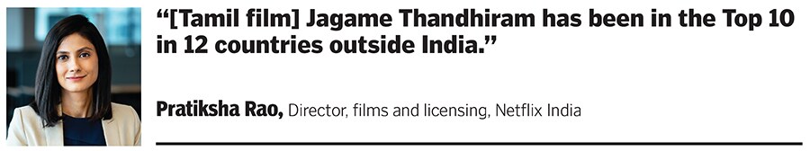“The Top 10 row on Netflix is a good indicator of what people in India and around the world are enjoying," says Pratiksha Rao, director, films and licensing, Netflix India. Their Tamil film anthology Navarasa, helmed by Mani Ratnam and Jayendra Panchapakesan, she says, was in the Top 10 in 10 countries including India, Malaysia, and Sri Lanka. Likewise, in its first week alone, the Dhanush-starrer Jagame Thandhiram drew an equal share of audience from outside India as it did within the country.