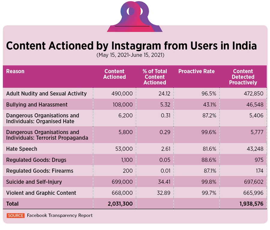 Of the 30.5 million pieces of content by users in India that Facebook actioned between May 15 and June 15, 81.9 percent was spam. This was followed by violent and graphic content which accounted for 8.2 percent of all content actioned. On Instagram, on the other hand, of the 2.03 million pieces of content that were removed, 34.4 percent were actioned for showing suicide and self-injury followed by 32.9 percent posts that were actioned for showing violence and graphic content.