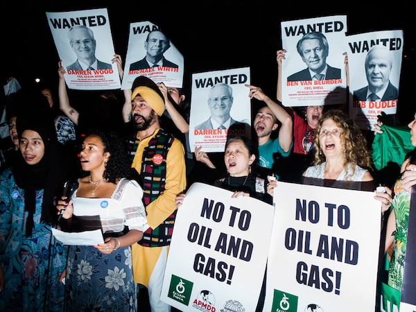 Demonstrators outside the Gramercy Park Hotel, where oil and gas executives were having a cocktail party, in New York, Sept. 22, 2019. On Sept. 23, as world leaders gathered at the United Nations climate summit and discussed the urgency of slashing carbon dioxide emissions from burning fossil fuels, 13 of the world’s biggest fossil fuel companies presented their defense at a forum across town. (Gabriela Bhaskar/The New York Times)[br]From the deck of a boat in New York harbor, the chief executive of Equinor squinted toward a stretch of sea where his oil company will soon build a giant wind farm. “We are doing all we can” to fight climate change, said the executive, Eldar Saetre.