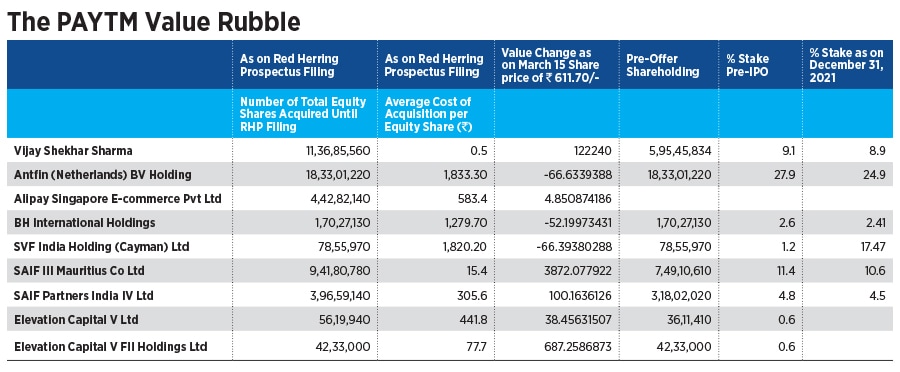 A look at Paytm’s red herring prospectus shows that Sharma’s average cost of acquiring each share stands at Rs 0.50 per share, or as much as you would pay to buy a toffee. But what about others? Jack Ma’s Ant Financial, which still owns 24.9 percent through Antfin (Netherlands) BV Holding in the company, had paid an average of Rs 1,833 per share to acquire shares in the company, which, in today’s market rout, stands at a loss of 68 percent.