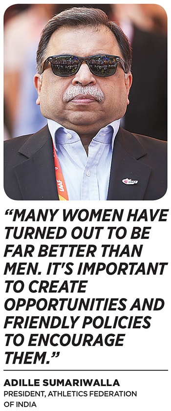 According to Athletics Federation of India (AFI) President Adille Sumariwalla, there is a dire need to promote representation of women in sports. “We need to create a pipeline for them. In fact, many women have turned out to be far better than men. The important thing is to create opportunities and friendly policies to encourage them," he says, adding that given that women usually have a larger share of domestic work at home compared to men, the pressure is always higher than male sportspeople. AFI is working to include more women in its technical staff, which is currently male dominated. From the coming season, there will be 20 percent women technical officials, which will gradually be increased to 50 percent over the next three years.