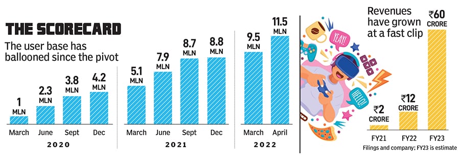 Two years later, the results are for all to see. The user base leapfrogged jumped from 1 million in March 2020 to 9.5 million this March. And the juggernaut continues to gather pace as the numbers shot to 11.5 million in April. Revenues too jumped from a few lakh in FY20 to ₹2 crore in FY21 to ₹12 crore in FY22. The startup is now clocking a revenue run-rate of ₹60 crore for FY23. In terms of funding, it found more takers. In January, it raised $25 million (around ₹185 crore) in a Series A round led by Lightbox, March Gaming and Duane Park Ventures.