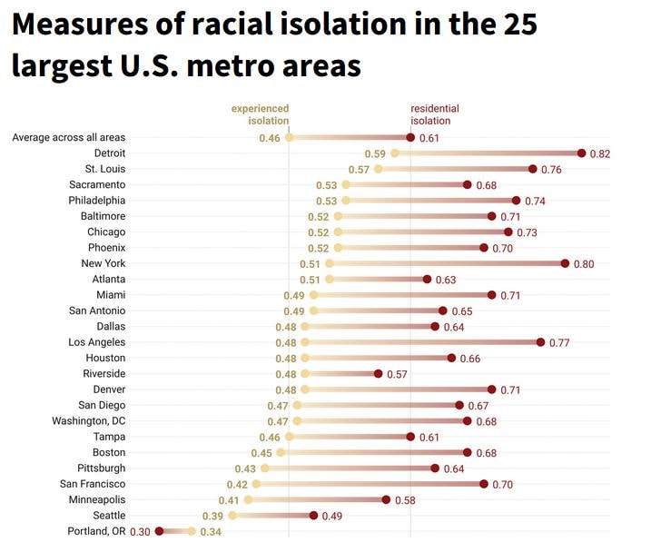 Experienced isolation was lower relative to residential isolation in cities with more population density and public transit use as well as higher levels of education, income, and income mobility. Among the most populous urban areas, Detroit, Philadelphia, and St. Louis had some of the highest measures of residential and experienced isolation Seattle, Orlando, and Portland, Oregon, had some of the lowest. (Portland, a relatively undiverse city, appears as an outlier on the chart below.)