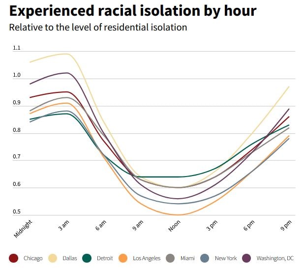 The experience of racial isolation also changes as people move around. Isolation was higher in the mornings and evenings, when Americans are more likely to be at home. “Lunchtime turns out to be a time of day when people mix more," Athey says. “People are coming in from the suburbs to work, and then everybody’s walking around together, going to lunch together in the middle of the city. That’s a time of day that exposes people to others."