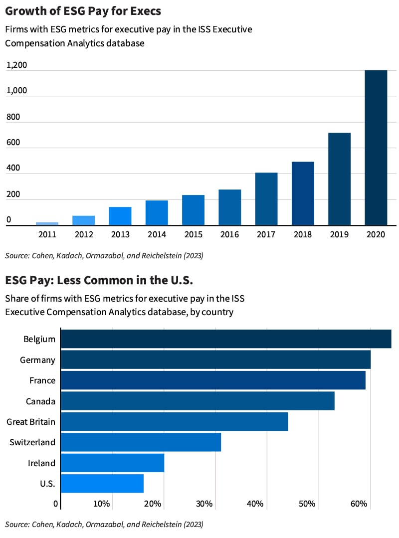 The researchers found a possible factor driving the growth of ESG pay: Institutional investors are more likely to increase their holdings in companies that have adopted ESG incentives for executive compensation. And companies that have been engaged by the “Big Three" of asset management — Vanguard, BlackRock, and State Street — are more likely to adopt ESG pay.