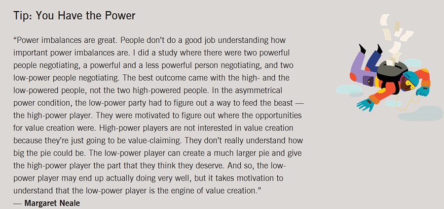Margaret Neale:“Before you even begin, you need to understand what your alternatives are and what your reservation price is. That’s the point of indifference between a yes and a no. Where is that that tipping point? If you are at your bottom line or your reservation price, you should be willing to flip a coin, and if it lands heads, you walk away. If it lands tails, you stay. That’s really hard for folks to do because we are so steeped in the belief that negotiations, in order to be successful, must get a yes. That book Getting to Yes is a real problem because the goal of a negotiation is not to get a deal. The goal is to get a good deal. So you need to understand where that point is where you’re willing to walk away."
