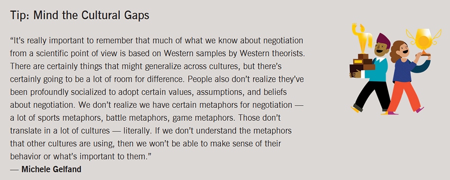 Michele Gelfand: “One of the most common misperceptions is that it’s an awful experience. When I’ve interviewed people about their metaphors for negotiation, a lot of times they will say it’s like visiting a dentist: It’s a necessary evil you’ve got to do it. It feels very intimidating, particularly for certain groups. Negotiation is inherently a cooperative exercise but you’re competing at the same time. So there’s this dance between being cooperative and competitive. A lot of times people put a lot of weight on the competitive part. I think about it as an incredible creative decision-making process where if you can really understand each other’s interests and then dig deep into how you can accomplish both of your priorities, it could be incredibly rewarding."