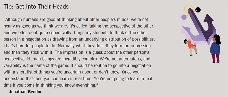 Bendor recommends doing “a basic strategic diagnosis" to explore the possible pathways an upcoming negotiation might take. “In most negotiations, there isn’t an unconditional answer to almost any question about, should I do X? If the situation is Y, you should do X. If it’s Z, you should not do X. You’re not being wishy-washy by saying that."