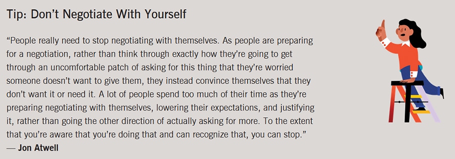 Jon Atwell: “A lot of people don’t negotiate their salaries and benefits enough for their first or second jobs. Coming out of school, you feel excited about your first job, your expenses are low, so you don’t have much of an imperative to negotiate hard. But through the miracle of compounding interest or compounding rates, small differences in the beginning can really add up. I also think that the confidence and assertiveness that you should bring to a negotiation signal good things about your ambition and commitment to a job."