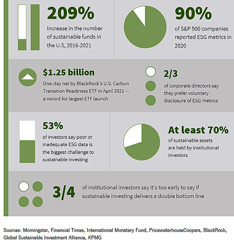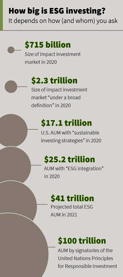 The market for investments that consider ESG criteria and seek ESG-related impacts is exploding. Estimates of its size vary widely. In 2020, the Global Impact Investment Network pegged the total market for impact investment at $715 billion, while the World Bank’s International Finance Corporation reckoned it was worth $2.3 trillion. The Global Sustainable Investment Alliance has tallied more than $25 trillion in assets under management using an “ESG integration approach" — a 143% increase since 2016. Whatever the figures may be, there’s no doubt that vast sums of money are now chasing financial rewards alongside returns such as reducing carbon emissions, strengthening worker protections, and diversifying boardrooms.