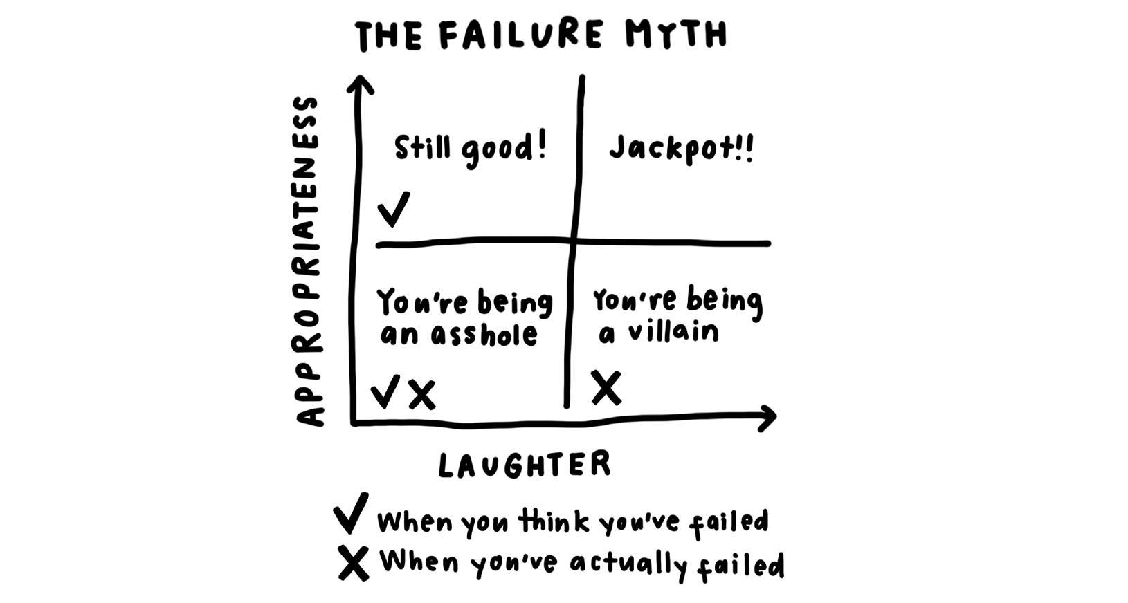 Despite my inability to crack the top left quadrant of the failure chart, I had avoided a whole other chart where all four quadrants are bad: the chart of seriousness. The quadrants there are robot, living in fear, unempathetic, and unable to use the same part of speech in a list. It’s a pandemic. You can’t afford to not be human. And there are few things more human than laughing. Humor is honesty, it’s being observant, it’s being present. And if that’s not what we need now, then I don’t know what is. Probably the vaccine. We really should get Chappelle on that.