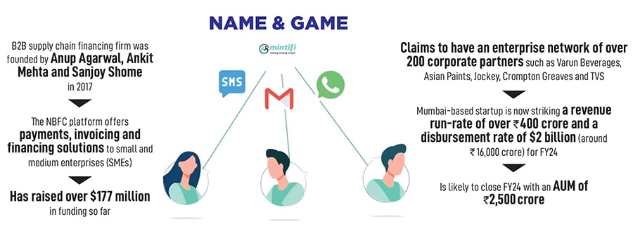Meanwhile, time was running out for the fledgling venture. Mintifi, a B2B supply chain financing firm that was started by Agarwal, Ankit Mehta and Sanjoy Shome in 2017, had so far managed to run the show by using half a million dollars that Agarwal had pumped into the business. After almost a year of bootstrapped life, Mintifi now needed venture money to grow. Though the idea behind Mintifi was freshly minted, the funding pitch unfortunately was viewed by the VCs from a stale lens: Yet another fintech, yet another NBFC, and yet another clone in a cluttered market. There were no takers. Five years later, in July 2022, there were again no takers. This time, Agarwal was stunned beyond belief. It had just been four months since Mintifi closed the Series C round of funding of $40 million in February 2022, and now the founder was again out in the market to raise a new round. The desperation to raise more was not hard to fathom. First, Mintifi was growing at a furious pace. Look at the numbers. From ₹30 crore in FY19, the amount disbursed in FY22 stood at a staggering ₹1,500 crore and the revenue during the same period jumped from ₹2.8 crore to ₹59 crore. In a business where the core raw material happens to be money, Mintifi needed more money to keep the rocket cruising. And there was a compelling reason to believe that the founders would be amply rewarded. Why? After three consecutive years of losses, Mintifi had posted a tidy profit of ₹3 crore in FY22.