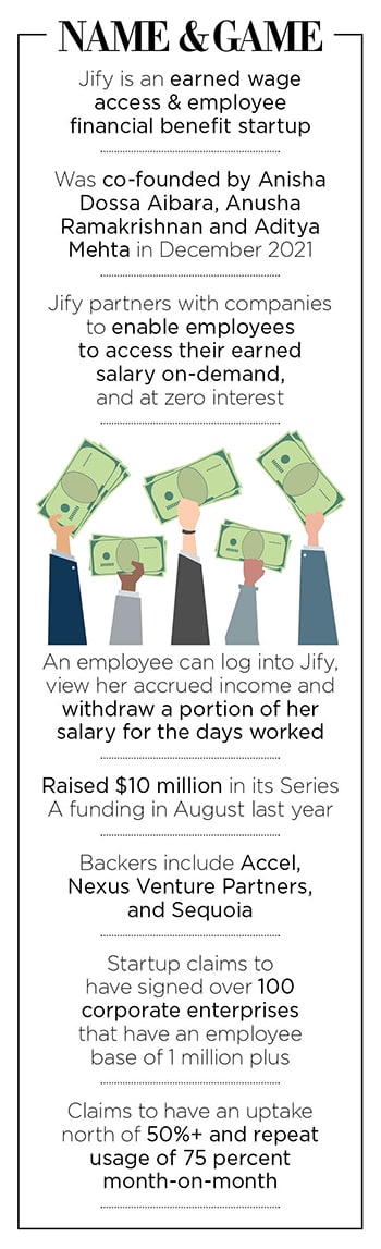 Jify partners with companies to enable employees to access their earned salary on-demand. An employee at a partner company can log into Jify, view their accrued income and withdraw a portion of their salary for the days worked. The startup, underlines Aibara, solves for the liquidity mismatch across blue-collar, grey-collar and white-collar workers. “It has been a fairytale beginning," she says, alluding to the brisk pace at which Jify has grown since December 2021.