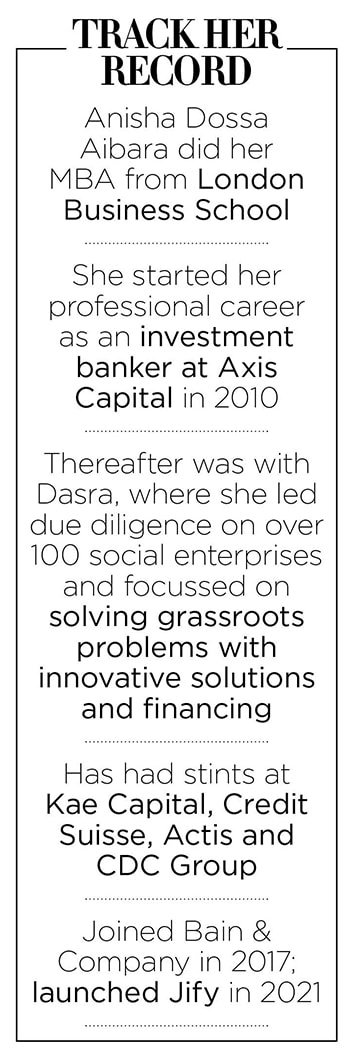 Dasra, a strategic philanthropy organisation, helped her work on the ground with communities and understand the ‘why’, ’when’ and ‘how’ of borrowing, and its impact on people’s lives. “I remember figuring out how to make financing viable for a ₹15,000 household toilet," she recalls, adding that she worked extensively on sanitation projects. The stint taught her how to marry finance and impact. The future had multiple stops—Kae Capital, Credit Suisse, Actis, CDC Group and Bain—that gave her extensive exposure to all aspects of business. Aibara finally rolled out her maiden venture Jify in December 2021.
