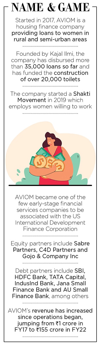 AVIOM (Adhering to Vision of Inclusion of Masses) provides housing loans to women in rural and semi-urban areas, catering to both salaried and self-employed categories. It provides loans ranging from ₹5,000 to ₹500,000 for home extensions, sanitation facilities and renovations. Founded in 2017 by Kajal Ilmi, who is also CEO, the company is “run by women, for women, and lends to women".