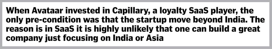 When Avataar invested in Capillary, a loyalty SaaS player, the only pre-condition was that the startup move beyond India. The reason was scale. An interesting thing about SaaS, he points out, is that it’s highly unlikely that one can build a great company just focusing on India or Asia. “If you look at 100 successful SaaS companies, 90 would have cracked the US market," he says.