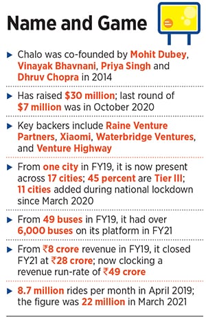Cut to March 2021. Chalo posted ₹28 crore revenue in FY21, and is now clocking a run-rate of ₹49 crore. It has over 6,000 buses on its platform across places such as Meerut, Mathura and Prayagraj in Uttar Pradesh Shimoga, Udupi and Hubli in Karnataka and Jabalpur, Sagar and Indore in Madhya Pradesh. Chalo counts WaterBridge Ventures, Raine Venture Partners and Xiaomi among its backers. “Our mission is to solve the daily commute for masses," says Dubey. While in big cities, buses serve as one more mode of transport, in Bharat, they are intrinsic to mobility. “Buses are the heart of transportation for smaller towns and villages," he says.