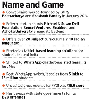 ConveGenius was launched to reach 100 million school students at the bottom of the socio-economic pyramid, and in 2020 teaching through Whatsapp helped it grow 15X