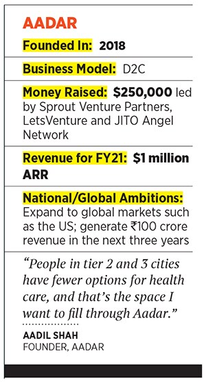 Mumbai-based startup Aadar, which focuses on tier 2 and 3 cities, has grown 400 to 500 percent in 2020-21, over the previous year, with its digital-first, direct-to-consumer model, and is operating at an annual run rate of $500,000. Founded in 2016 by Aadil Shah, it raised $250,000 in a seed round in 2019 from Sprout Venture Partners, LetsVenture and JITO Angel Network.