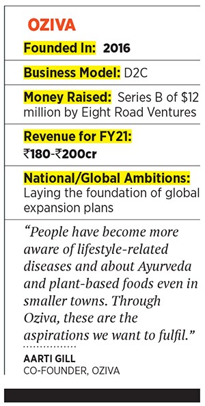 Also riding the internet wave into tier 2 and 3 cities is Oziva, a plant-based nutrition brand that combines Ayurveda. Says co-founder Aarti Gill, “There is growing awareness, as well as growing incomes, and growing stress levels. So although our focus has always been on women in tier 2 and 3 cities, we’re seeing a rise in demand for clean, plant-based products from all over the country." In 2020, Oziva’s annualised revenue stood between ₹180 crore and ₹200 crore, after growing 3x from June 2020, and it is targeting ₹500 crore in the next three years.