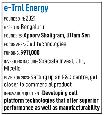 Apoorv Shaligram and Uttam Sen started e-Trnl Energy in 2021 when they saw an opportunity to tackle some of the fundamental problems with electric vehicle (EV) battery cells today, such as heating, charging time, and the life of the cells and batteries.