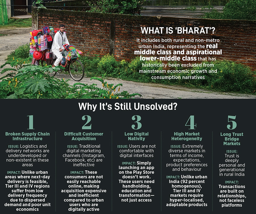Building for Bharat comes with hurdles. Supply chain infrastructure is weak, demand is scattered and logistics are poor. Customer acquisition is not easy, either, because many people are not active on digital platforms and even if they are, expecting them to navigate complex app flows like urban users is unrealistic.