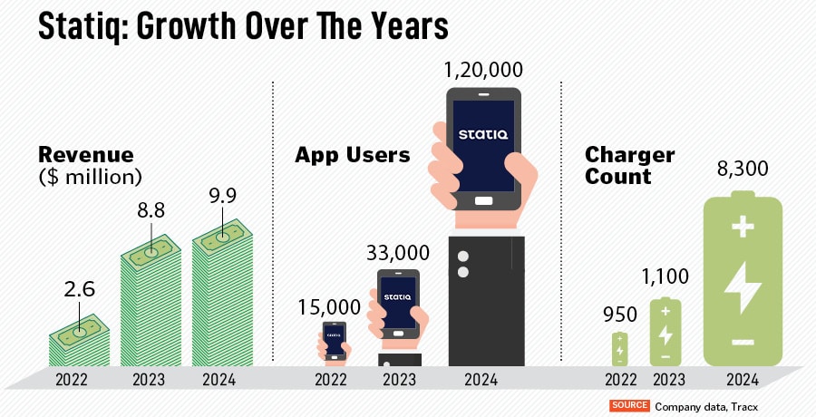 With the increased sales of hardware products and network expansion, Statiq’s revenue jumped to $8.8 million in FY 2023 and $9.9 million in FY 2024. The number of app users has reached 1.9 lakh. Besides the small commission from CPOs on the network, the company generates the bulk of its revenue through hardware sales.