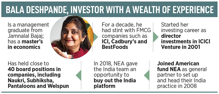 If you are talking to Bala Deshpande, expect nothing less than an incisive and a brutally candid conversation. “I’ll be very honest," says the seasoned investor who began her investment career with ICICI Ventures in 2001, and has held close to 40 board positions in companies across industries over the last two decades. “There are moments when I too did not really understand why this is happening, or why it should happen," she says, alluding to a spike in the valuation of startups that spooked many within and outside the startup ecosystem last year. A glut of capital, reckons Deshpande, was the culprit. “Capital will flow to places where the return lies," underlines the investor, who joined the American venture fund NEA in 2008, and co-founded MegaDelta along with Tarun Sharma and Ruchir Lahoty in 2018.