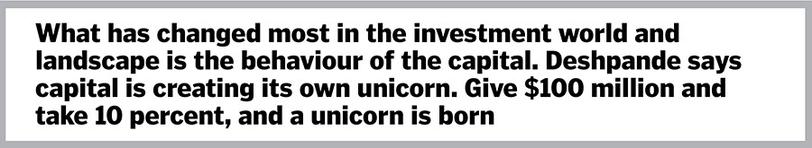 What has changed the most, though, is the behaviour of capital. “Capital is creating its own unicorn," underlines Deshpande. Give $100 million and take 10 percent, and a unicorn is born. Now, it doesn’t matter whether the company has a ₹2 crore revenue or more than that. The investor is betting on a future promise. The fact that a company with such a turnover is ready to take $100 million is the first big change. Then there are guys who are making such bets… that is the second big change. So, for people with a lot of capital, outlaying $100 million is a small portion of the total fund.