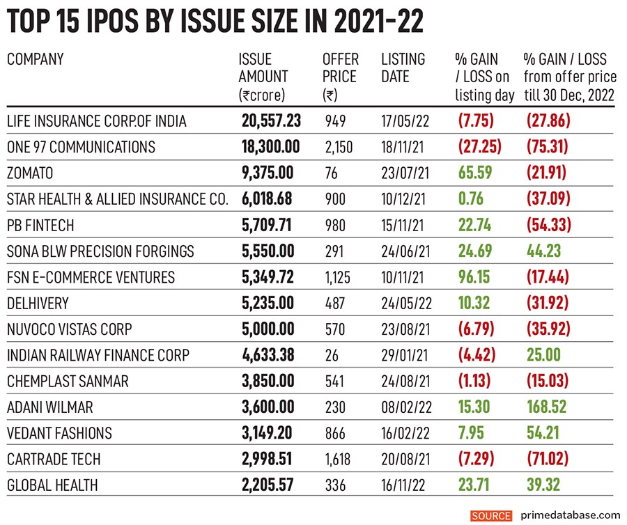 The largest IPO in 2022, which also happens to be the largest ever Indian IPO, was of Life Insurance Corporation of India (LIC), which was followed by Delhivery (₹5,235 crore) and Adani Wilmar (₹3,600 crore). LIC, which listed at ₹865, an 8.62 percent discount to the issue price of ₹949, was trading at ₹711.65 on January 9. Adani Wilmar, which reportedly has had a high of ₹878 and a 52-week low of ₹227, closed at ₹568.35 on January 6.