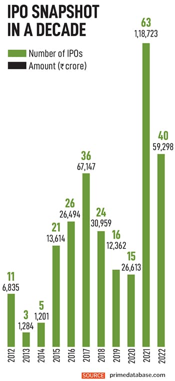 Experts are not surprised by the performance. “The IPO response was muted by moderate listing performance," points out Pranav Haldea, managing director at Prime Database Group. Average listing gain (based on closing price on listing date) fell to 10 percent in comparison to 32.19 percent in 2021, and 43.82 percent in 2020.