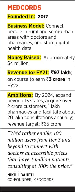 Over the next three years, MedCords wants to add 2 crore users and 1 lakh medical stores to their network, and take revenue up to ₹65 crore by facilitating more than 20 lakh consultations annually. Mehta, who grew up in a family of doctors, knows that it is loyalty that often creates legacy in rural health care. Building loyalty in this market takes time, and MedCords is playing the long game.