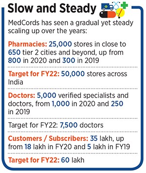 Today, MedCords has a network of about 25,000 pharmacies in 650-odd towns and cities across 13 states, and close to 5,000 doctors and specialists on their platform. They are mostly present in North and Central India. The medicine delivery follows a hyperlocal model, which reduces the delivery time to approximately 60 minutes, the founders claim. To ensure people are able to consult doctors within 30 minutes, a case is floated to all relevant specialists on the network until a doctor takes it up. The customer base is over 3.5 million people this year, up from 0.5 million in FY19 and 1.8 million in FY20.