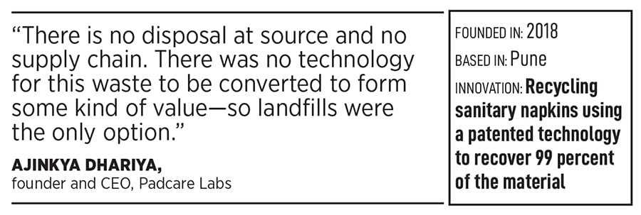 In 2018, Dhariya was visiting a landfill near Pune, when he saw ragpickers picking up used sanitary napkins and diapers with their bare hands. Dhariya couldn’t believe what he had seen. “Imagine the kind of health risk," he says, “This was the trigger point for me, I knew I had to do something about this problem." This is what led him to start Padcare Labs.