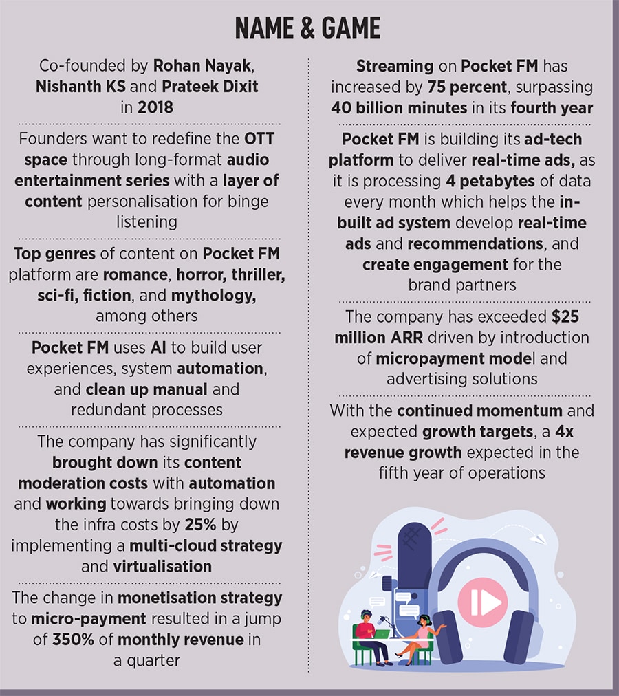 In the cacophony of social media and short videos, with people speaking over each other, three young engineers ventured out to offer long format audio series in India, an idea that appeared to not work from the get-go given people’s shrinking attention spans. But the idea of a long-format audio series hit the right chord and is today generating $25 million ARR (annualised revenue run-rate), an achievement, Pocket FM boasts, it has clinched in its fourth year of launch.