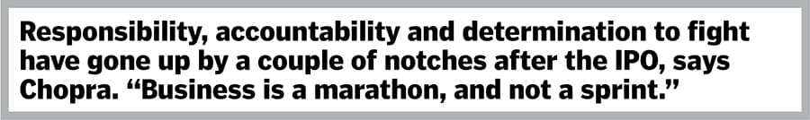 Okay, accepted. But has the life of the founder changed after the listing? Chopra points out the biggest shift. “Responsibility, accountability and determination to fight have gone up by a couple of notches," he smiles. Business, he reckons, is a marathon, and not a sprint. “In a marathon, you need to keep yourself hydrated. It’s a long run," he says, adding that the best way to stay hydrated is to just focus on inputs. “I am convinced that eventually the output will catch up with the input if one continues to hustle," he signs off.