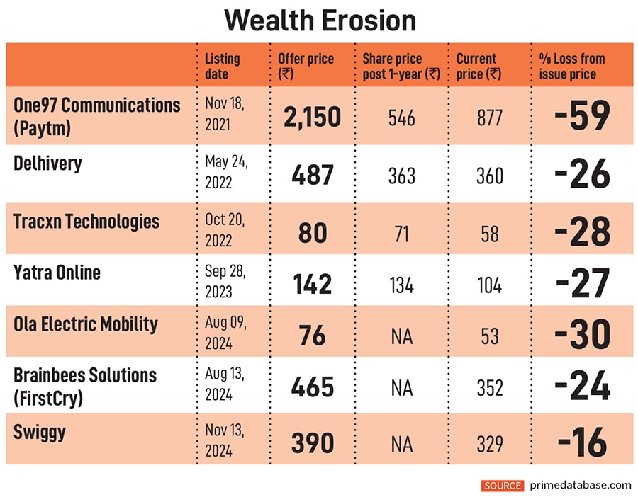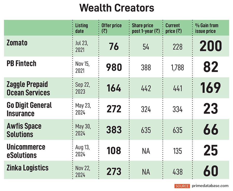 It would be unfair to paint all startup IPOs with the same brush a few have defied the trend, navigating market challenges, delivering on promises and creating wealth for public shareholders. Take, for example, Zaggle Prepaid Ocean Services, Unicommerce e-Solutions (promoted by Kunal Bahl and Rohit Bansal), Go Digit General Insurance, Awfis Space Solutions and Zinka Logistics Solutions.
