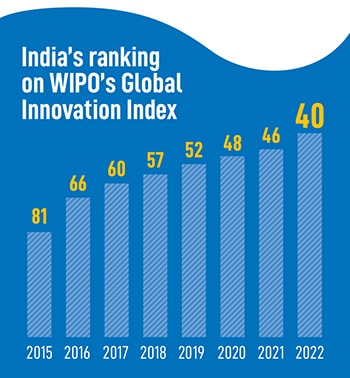 From a headlines perspective, over the last several years, the government’s efforts have indeed raised the profile of technology-led startups—as a proxy for innovation—in the country. A Union minister pointed out last September that India’s rank on the global innovation index, compiled every year by the World Intellectual Property Organization (WIPO), a United Nations agency, has jumped 41 places from 81 to 40 between 2015 and 2022.