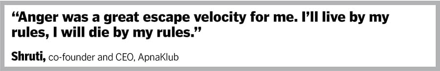 Shruti, for her part, contends that she is well-placed to navigate all odds. Her mercurial anger was a great escape velocity for her for a long period of time. “It helped me race ahead and prove others wrong," she says, though she realises that anger as an emotion can take her only till a point. “Once you achieve a particular trajectory, try to channelise anger and make it productive," she says, adding that she would prefer to be known as an entrepreneur and not a woman entrepreneur. “Angry woman still remains my favourite," she signs off.