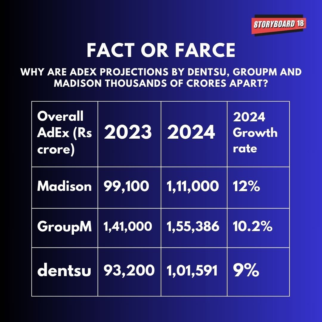 The difference in these projections is not a couple of thousands but thousands of crores. To be precise, the gap between Dentsu and GroupM AdEx projections is Rs 53,795 crore.