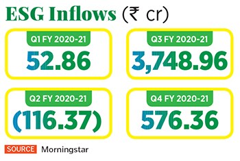 The Covid crisis has been an inflection point because investor interest and money flowing into ESG funds have significantly increased, says Kaustubh Belapurkar, director of fund research at Morningstar India. For one, at least half a dozen asset management companies, including ICICI Prudential AMC, Kotak and Aditya Birla, have introduced ESG-centric fund plans since October 2020. While SBI Magnum Equity ESG Fund is the oldest ESG fund in India, repositioned as an ESG fund in May 2018, the latest is the Invesco India ESG Equity fund launched this March. According to data from Morningstar, there was a net inflow of ₹3,749 crore into ESG funds in the quarter ended December 2020. Net inflow in the quarter ended March 2021 stood at ₹576 crore.
