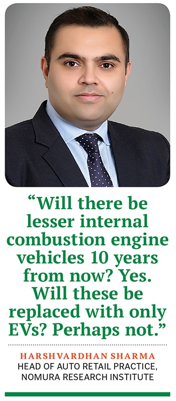“It’s probably a little optimistic to think of existence of only EV powertrains in the next nine years in India given the expanse and sheer size of the Indian market," says Harshvardhan Sharma, head of auto retail practice at Nomura Research Institute. “Even China, the EV global leader in sales, by 2030 is expected to achieve only 40 percent at a 120,00,000 volume. Surely, there will be an uptake of alternate power trains… however there is an assortment of alternate powertrains to choose from such as hybrids, CNG, flex fuels and even hydrogen, if we are speaking futuristically."