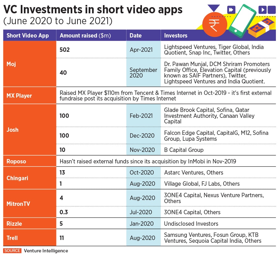 Besides Moj, the leading apps in the space include Times Internet-owned and Tencent-funded MX Takatak, Daily Hunt’s Josh app and InMobi-owned Roposo. Together they have raised around $750 million since June 2020, according to data provider Venture Intelligence. “Just four players have received so much funding. The short video space would not have grown at this scale and speed, if not for the ban," says Anil Kumar, founder and CEO of RedSeer Consulting. “India is at a tipping point. We produced more unicorns last year [13] than China [three]," he says.