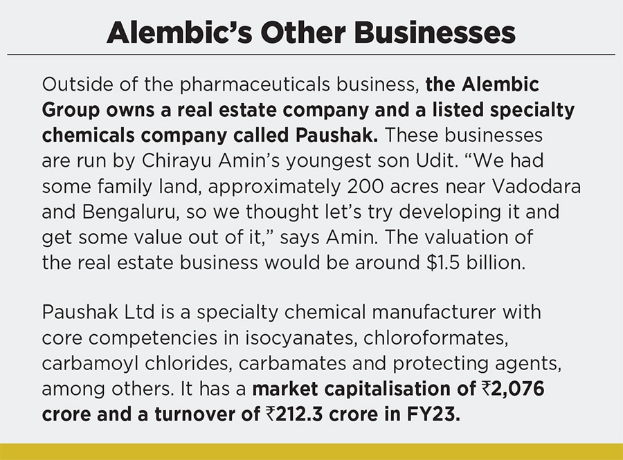 Amin has his succession plan for the multiple companies under the Alembic Group all set. Pranav and Shaunak are looking after the pharmaceuticals business and his youngest son, Udit is looking at real estate and the specialty chemicals business, Paushak. The patriarch says, “At the moment, whatever was possible within the ambit of business, we have settled… the succession plan is working well."