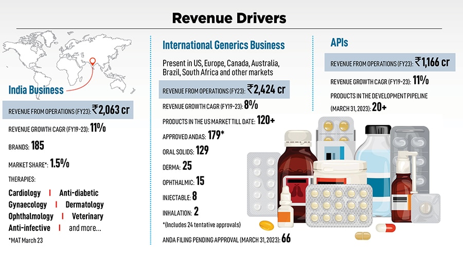 In 2005, Alembic was stuck with an outdated portfolio of legacy brands, with barely any “molecules of choice". Today, after reorganising the portfolio, “we are 80 percent where we need to be," says Shaunak. Currently, the India business accounts for Rs 2,063 crore of the company’s total revenue, growing at a CAGR of 11 percent (FY19-23).