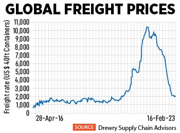 The Covid-19 pandemic saw global freight rates rise dramatically. The World Container Index started climbing from April 2020, from $1,492 from a 40-foot container before peaking at $10,377 in September 2021. As global trade slows, rates have now fallen back to $2,035 in February 2023. With global trade growth slowing, it remains to be seen which way they head now. The World Trade Organization, which had forecast global trade to grow at 3.5 percent in an October 2022 forecast, expects growth in 2023 to slow to 1 percent. India’s merchandise exports and imports were both down in January 2023, falling 7 percent and 3.7 percent to $32.91 billion and $50.66 respectively.
