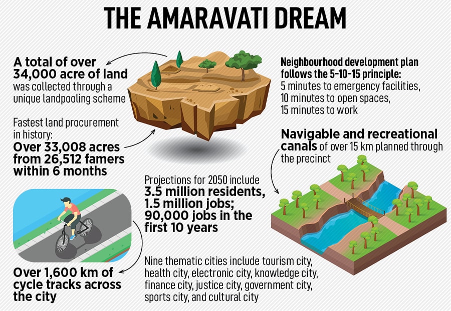 Additionally, since the farmlands were being taken away, the government also began paying an annuity for lost income that ranged between Rs 30,000 and Rs 50,000, with a 10 percent enhancement every year. The capital city was to be spread over 216 sq km, and house over 3.5 million people with the completion set for 2029. The Naidu government had anticipated a capital expenditure of Rs 51,000 crore for the first phase of its development.
